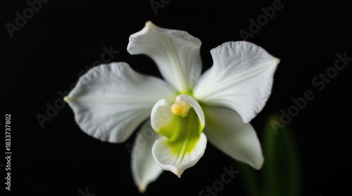 © Sai, Fototapeta premium Delicate white orchid bloom with green center against a dark background