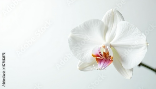 Fototapeta premium Delicate white orchid blossom against pure white backdrop, fresh, bright