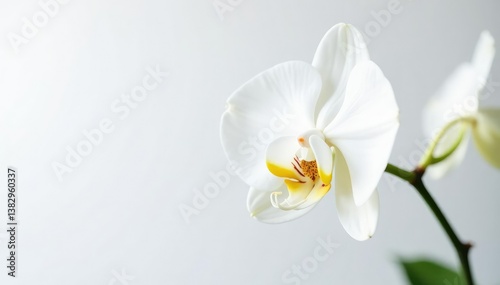 Fototapeta premium Delicate white orchid blossom against pure white backdrop, white background,...