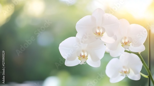 Fototapeta premium Delicate white orchids blooming in soft sunlight showcasing nature's beauty...