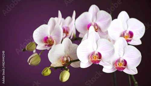 Obraz premium Delicate white orchids with pink accents bloom vibrantly against a deep purple backdrop
