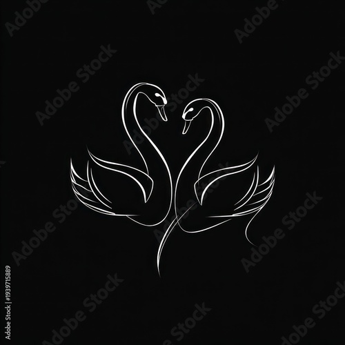 Fototapeta premium Delicate white outline of two swans forming a heart, against a stark black...