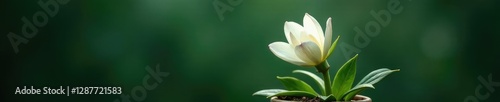 © Atittaya, Fototapeta premium Delicate white petals unfolding from a dark green pot, frostkiss, delicate, botanical