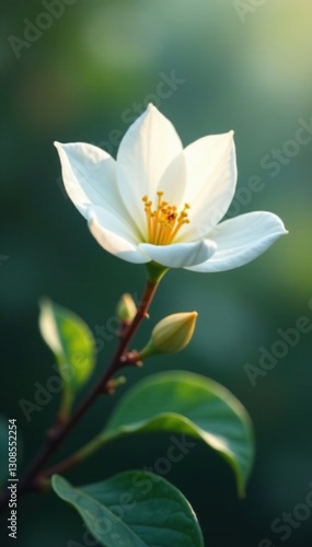 © saksayam, Fototapeta premium Delicate white petals unfolding on a slender branch, branches, leaves
