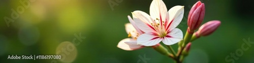 © Withun, Fototapeta premium Delicate white petals with red stripes unfurl from a sturdy double flower stem, double flowers, spring blooms