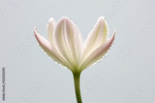 Fototapeta premium Delicate white pink flower in bloom, with drops of water adding a fresh touch, captured on a neutral white background