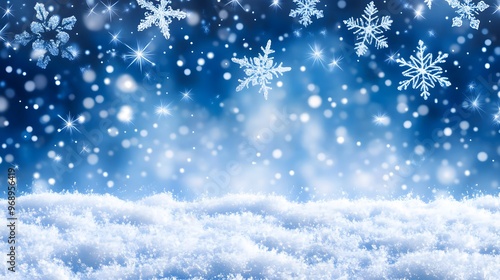 Fototapeta premium Delicate white snowflakes gently fall against a soft, blurred blue background, creating a serene winter scene. The snow-covered landscape adds a peaceful, seasonal ambiance.