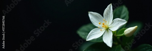 © Wachiraporn, Fototapeta premium Delicate white star leaf flower on a dark background, bloom, black background, detail