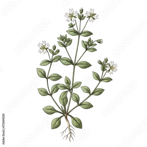 Fototapeta premium Delicate white wildflower with green leaves and roots isolated on a...