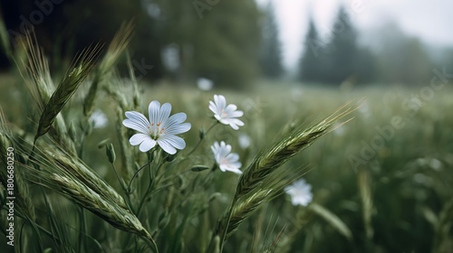 Obraz premium Delicate white wildflowers bloom in a misty meadow surrounded by tall green grass and grain stalks in soft morning light