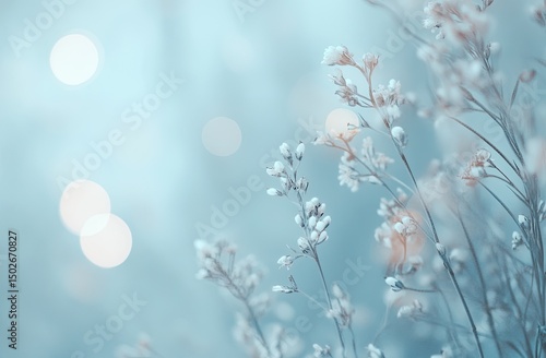© designlove std, Fototapeta premium Delicate white wildflowers stand tall against a soft blue sky with blurred bokeh