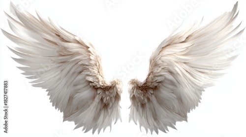 © mila103, Fototapeta premium Delicate white wings made of soft feathers are spread wide against a plain background. These wings symbolize purity freedom and a connection to the divine evoking feelings of inspiration.
