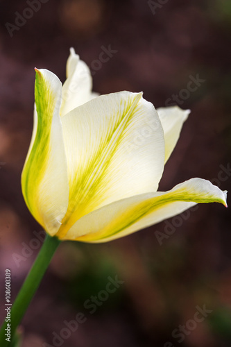 Obraz premium Delicate white with yellow tulip against green garden background.