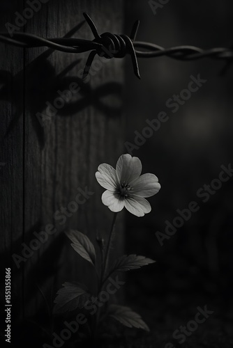 Obraz premium Delicate Wildflower Beneath Barbed Wire Shadow, Hope and Contrast in Harsh...