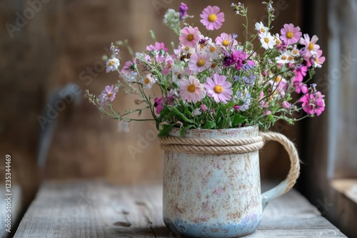 Fototapeta premium Delicate wildflowers arranged in a rustic ceramic mug