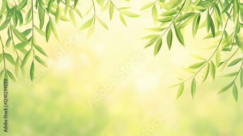Fototapeta premium Delicate willow branches in fresh green, soft morning light, serene and...