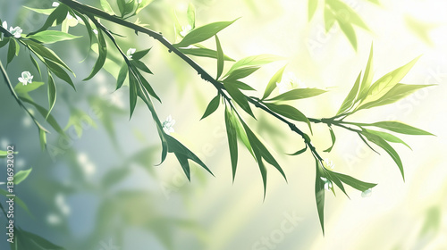 Fototapeta premium Delicate willow branches with fresh green leaves, soft pastel flowers in the background, warm sunlight filtering through, serene and peaceful atmos