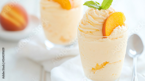 © venusvi, Fototapeta premium Delicious and creamy peach mousse topped with fresh peach slices and mint leaves, perfect for dessert lovers and summer gatherings.