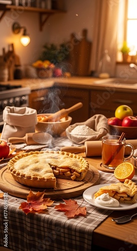 © Gunung, Naklejka premium Delicious apple pie on a wooden table with fall harvest elements