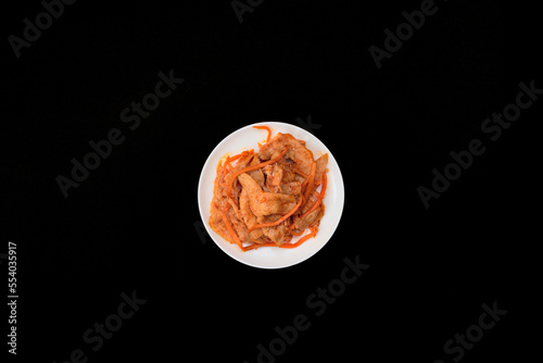 © Rina Mskaya, Fototapeta premium Delicious asian soy vegan meat salad on white plate on black background. Selective focus. Asian food concept