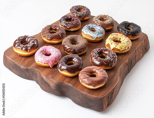 Naklejka premium Delicious Assorted Donuts Displayed on Wooden Board, Perfect for Sweet Treats