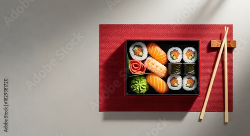 © ARdesignAi, Obraz premium Delicious assortment of sushi rolls and nigiri served on a red placemat