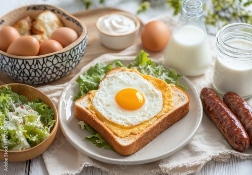 Fototapeta premium Delicious Breakfast Spread Featuring Fresh Vegetables, Fried Egg on Toast, Sausages, Eggs, Milk, and Yogurt in a Cozy Kitchen Setting