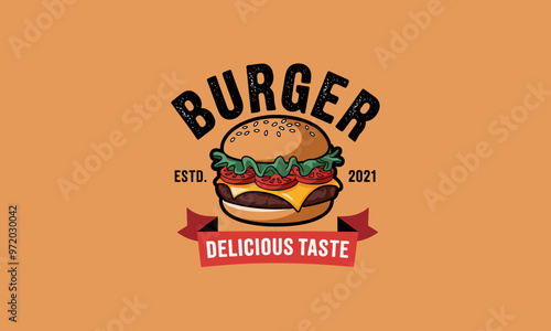 Fototapeta premium Delicious burger logo with cheese, lettuce, and tomatoes, established 2021.