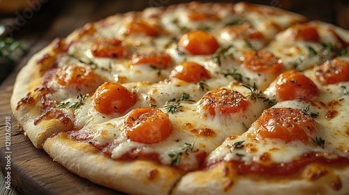 Fototapeta premium Delicious cheese pizza topped with cherry tomatoes, thyme, and salt.