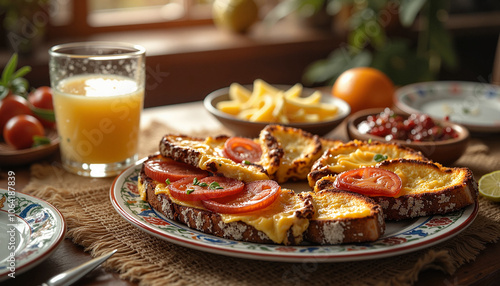 © Iuliia, Fototapeta premium Delicious cheese toast breakfast with orange juice