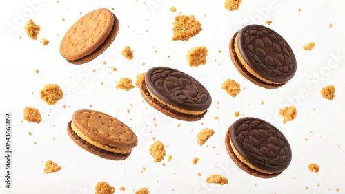 © Jamshadul, Fototapeta premium Delicious chocolate and vanilla sandwich cookies falling against white background