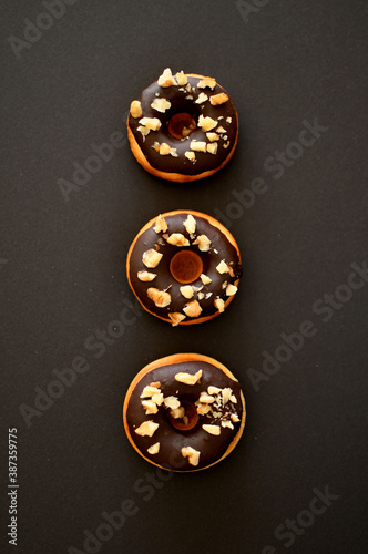 © Sofija, Fototapeta premium Delicious chocolate donuts isolated on a black background.