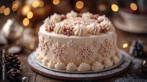 © Denys, Fototapeta premium Delicious christmas cake decorated with snowflakes standing on wooden table