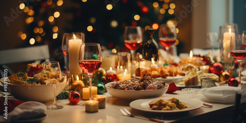 Fototapeta premium Delicious christmas dishes arranged on a festive table with sparkling lights...