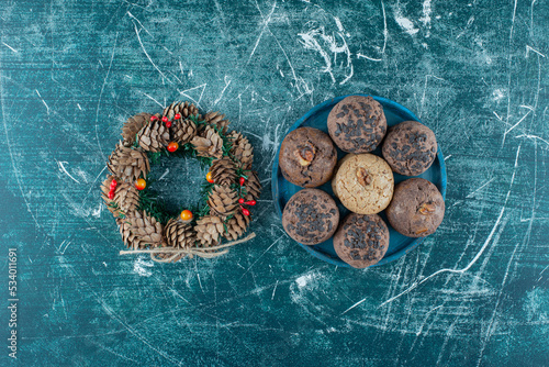Naklejka premium Delicious cookies with a wreath on a marble background