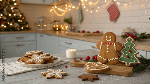 © Benxiumo, Naklejka premium Delicious decorated gingerbread cookies resting on a rustic wooden table in a warm festive kitchen illuminated by string lights