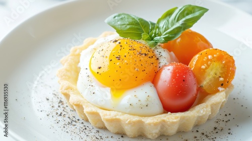 Fototapeta premium Delicious egg tart with cherry tomatoes and basil gourmet food in bright...
