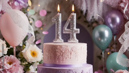 © tanya78, Fototapeta premium Delicious festive cake with candle number 14
