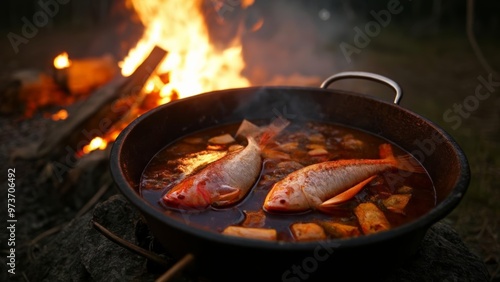 © SwathiFX, Fototapeta premium Delicious fish stew cooking over a campfire