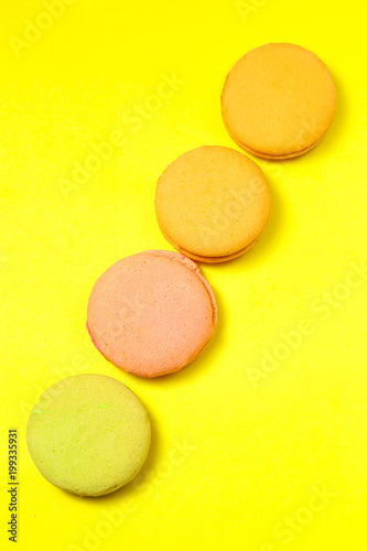 Obraz premium Delicious four multicolored macaroon on a yellow background