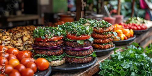 Fototapeta premium Delicious gourmet vegan burgers stacked high with fresh vegetables and garnishes ready to eat.