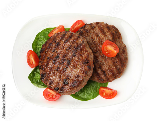 Obraz premium Delicious grilled meat patties, tomatoes and spinach isolated on white, top view