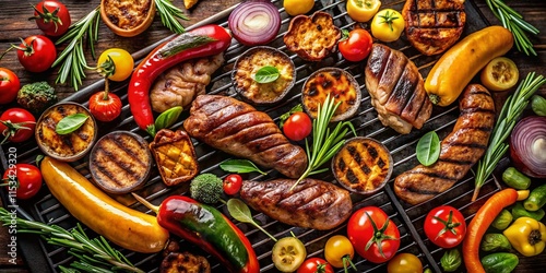 © prapatsorn, Fototapeta premium Delicious Grilled Meat & Veggie BBQ Feast - Top View Isolated White Background