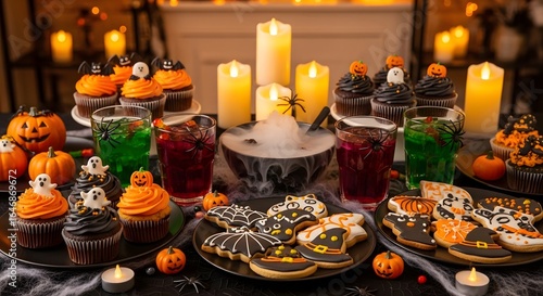 Naklejka premium Delicious Halloween treats cupcakes, cookies, and drinks on a festive table
