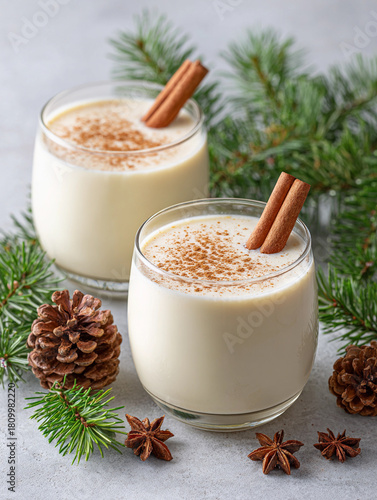 © Iryna, Fototapeta premium Delicious holiday coquito drinks with cinnamon and festive pine decorations on a winter table
