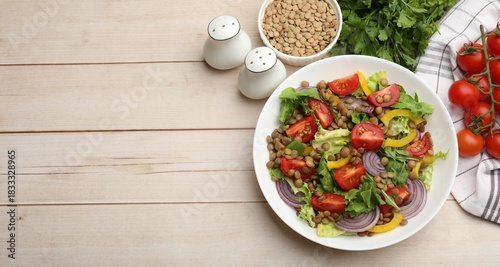 © New Africa, Naklejka premium Delicious lentil salad and ingredients on light wooden table, flat lay. Space for text