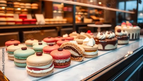 Naklejka premium Delicious Macarons and Cakes Displayed in a Pastry Shop