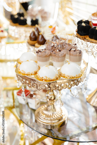 Fototapeta premium Delicious macarons and pastries decorating a luxurious candy bar buffet