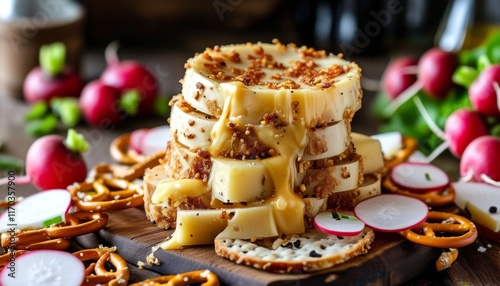 Naklejka premium Delicious Obatzda Cheese Spread Mounded on Rustic Wooden Board with Fresh...