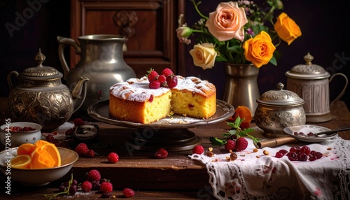 © Ariljayar, Fototapeta premium Delicious Raspberry Cake with Vintage Tea Set